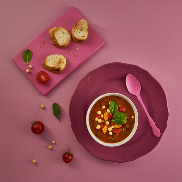 Összetevők: zöldségek változó arányban (36%) /csicseriborsó (30%), pritamin paprika, sárgarépa, spenót (20%)/, ivóvíz, hámozott paradicsom /hámozott paradicsom, paradicsomlé/, vöröshagyma, barna rizsliszt, kókuszolaj, étkezési só, fűszerek