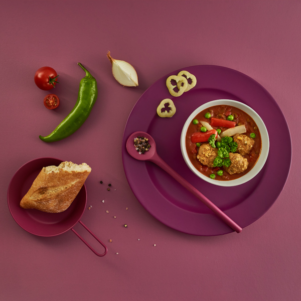 Összetevők: lecsó zöldségek változó arányban (38%) /paprika (33%), pritamin paprika, zöldborsó/, 3 db pulykagombóc /pulykacombfilé (75%), barnarizs, ivóvíz, barna rizsliszt, lenmagliszt, étkezési só, fűszerek/, hámozott paradicsom (11%) /hámozott paradicsom, paradicsomlé/, vöröshagyma, ivóvíz, sűrített paradicsom (4%), kókuszolaj, barna rizsliszt, étkezési só, fűszerek